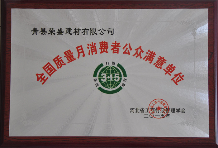 青縣榮盛建材獲得全國質(zhì)量月消費者公眾滿意單位